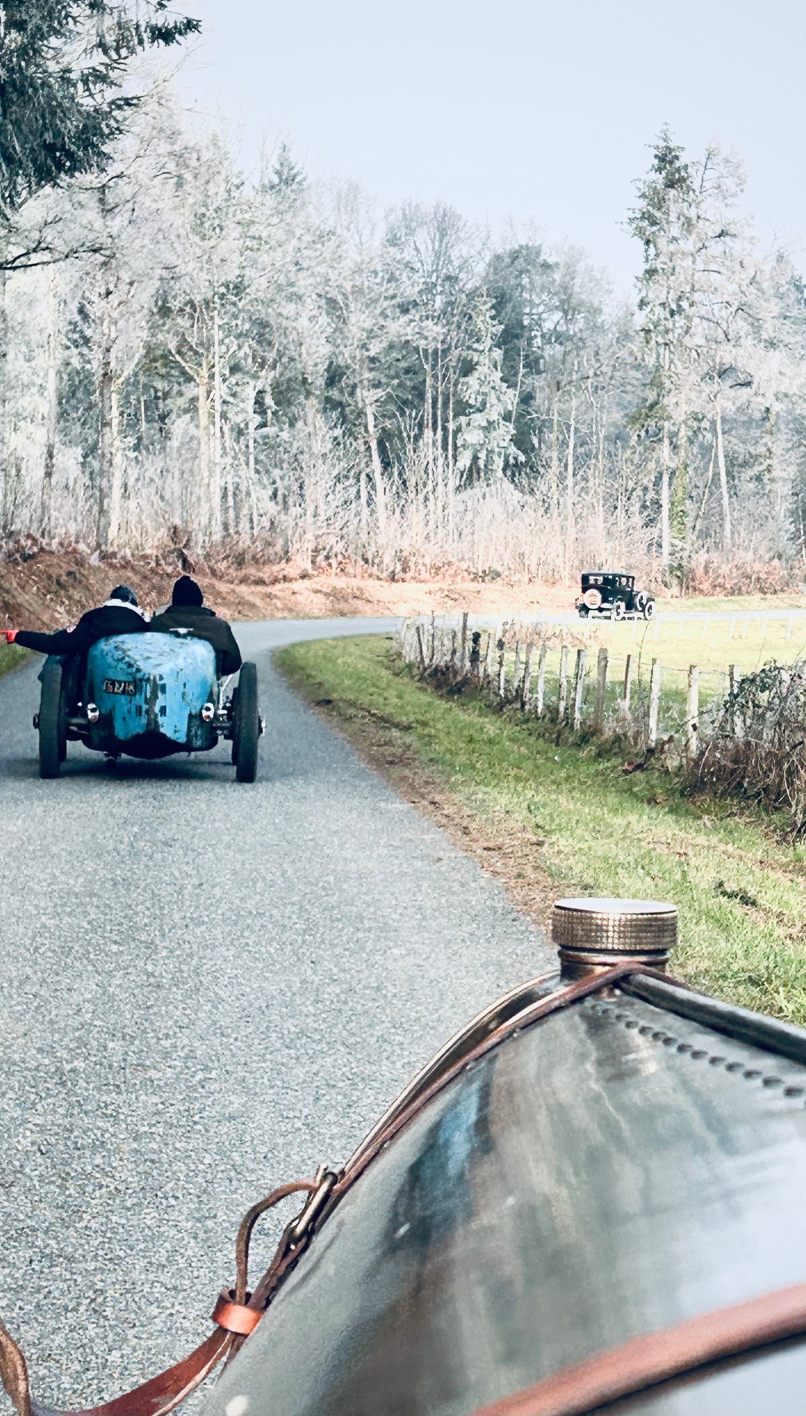 Côté voitures, dans ce contexte polaire, dire que les équipages en voitures fermées sont avantagés est assez illusoire. Dans la mesure où il ne pleut pas, les équipages enfermés dans des caisses carrées, sont ni plus ni moins installés dans des frigos ! Les moteurs des cyclecars, peuvent au moins apporter un petit peu de chaleur aux pieds, pendant que les paumettes brûlent sous l’effet du vent glacial. Pour ce qui est de la conduite, les plaques de verglas et le brouillard givrant sont là pour réellement “mobiliser” le conducteur. Tandis que le passager tente de déchiffrer tant bien que mal le road-book, le jockey manie la pédale de gaz avec délicatesse. En hiver, les godasses de plombs ont vite fait de se faire châtier. En période de frimas, les rétrogradages doivent être dosés, les trajectoires précises et par dessus tout le sens de la cohésion doit être omniprésent.