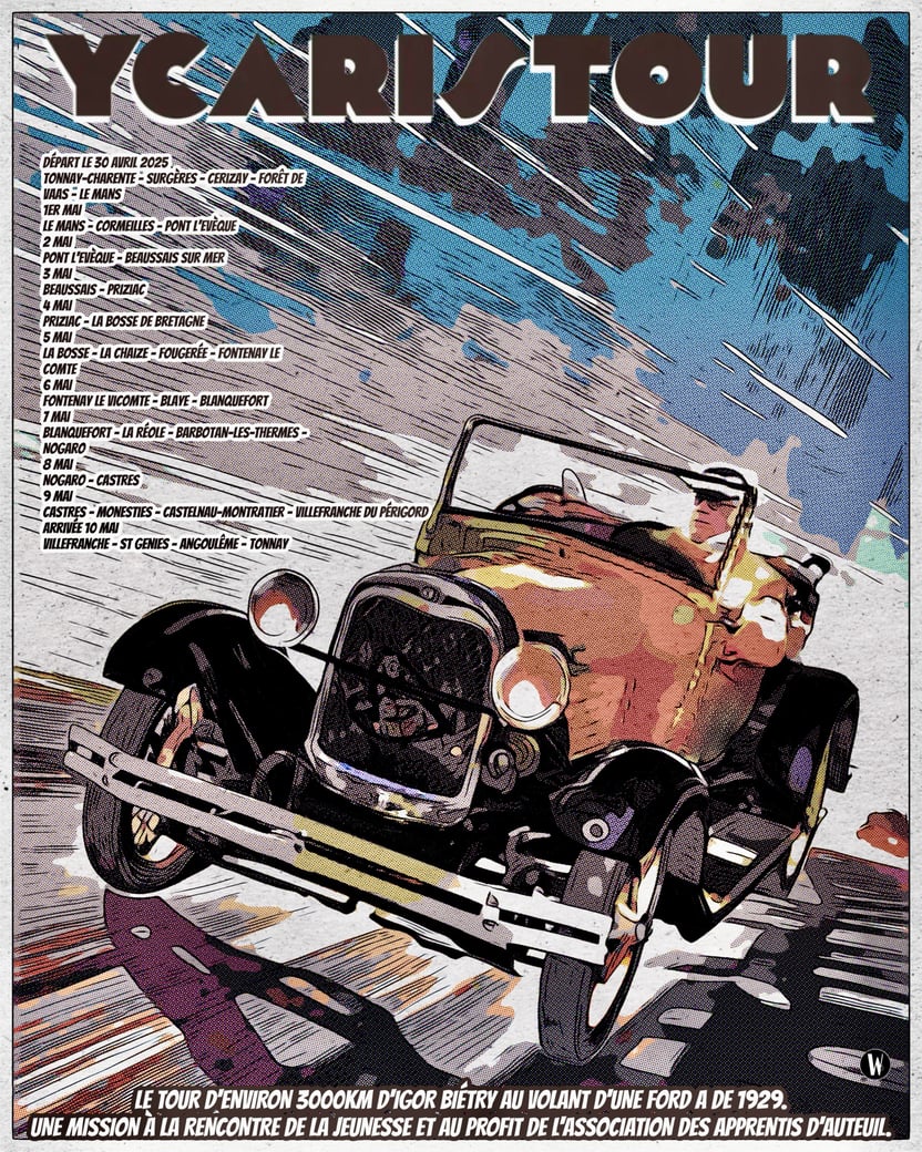 Cette fois-ci le challenge est de faire un tour de l’ouest de la France d’environ 3000 km au volant d’une Ford A de 1929. Cette balade sur les petites routes a pour ambition d’aller à la rencontre des jeunes générations et de faire valoir les notions de partage et de transmission auprès des mouflets. Je crois beaucoup en cette passation et roulerai ainsi au profit des Apprentis d’Auteuil.